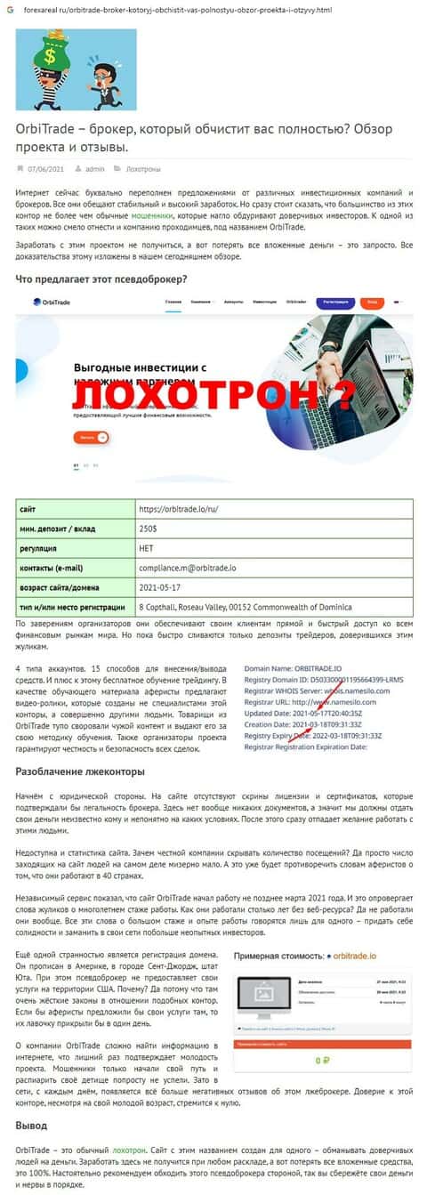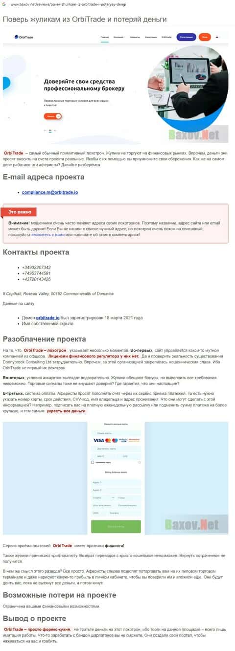 OrbiTrade io - еще одна псевдо-брокерская организация, которая обманывает людей на деньги рассказывая сказки о невероятной прибыли, данная скам-контора обзавелась негативной репутацией в сети, аферисты скрывают информацию о руководстве компании, что является одним из признаков мошеннической организации, жульническая контора Orbi Trade зарегистрирована в оффшоре, на острове Доминика. Не рекомендуем связываться с шулерами Орби Трейд !!!