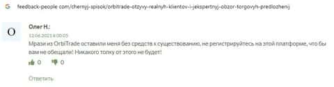 Далее предоставлен еще один отзыв о том, что доверять жульнической компании Orbi Trade ни в коем случае нельзя, как и прочим подобным конторам.