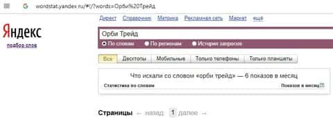 Количество брендовых запросов названия компании на английском языке "OrbiTrade" на wordstat yandex ru составляет 41 запрос за месяц.