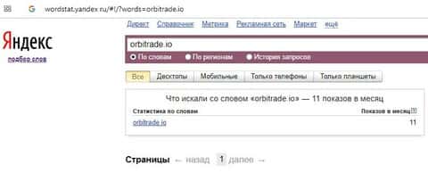 Количество запросов по бренду название домена компании "orbitrade.io" на Вордстарт Яндекс Ру составляет 11 показов за месяц.