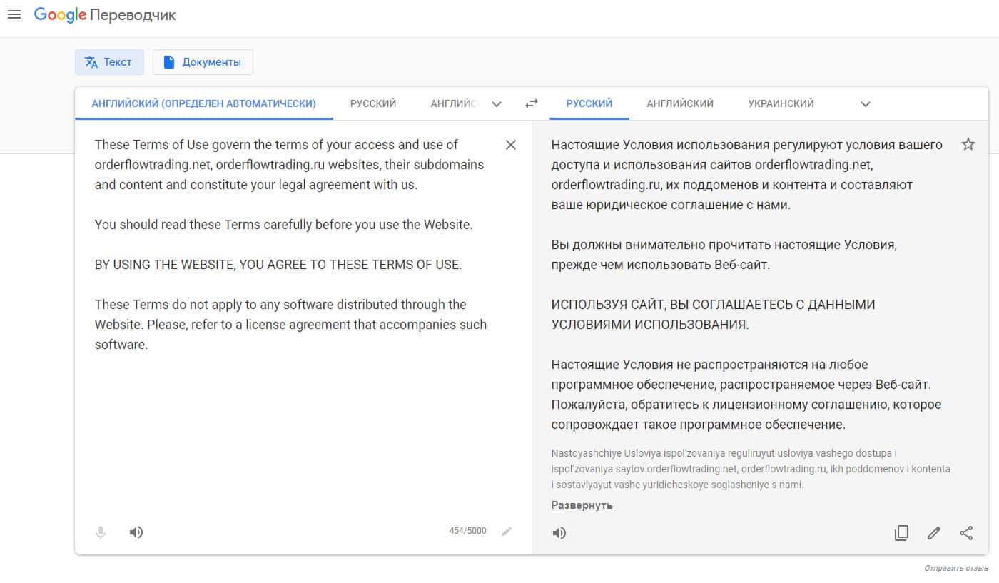Несмотря на то, что сам сайт у аферистов Ордер Флоу Трейдинг предоставлен на русском языке сами же условия сотрудничества у шулеров Order Flow Trading предоставлены на английском, что говорит о не особом желании аферистов Ордер Флоу Трейдинг знакомить пользователей со своими условиями сотрудничества.