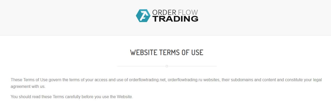 Сами же условия сотрудничества у жулья Ордер Флоу Трейдинг начинаются с довольно типичной и банальной информации о том, что это за документ и зачем он нужен, в ходе которой шулера Order Flow Trading говорят о том, что пользователь соглашается с данными условиями фактом использования сайта, что вы можете наглядно прочесть ниже.