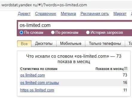 И последний запрос в яндексе на английском языке с точкой "os-limited.com" выдает результат в 73 показа в месяц.