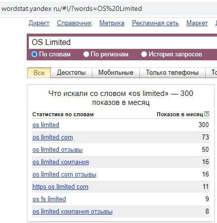 Второй запрос в яндексе на английском языке "OS Limited" выдает уже результат в 300 показов в месяц. Это намного больше, чем в предыдущем случае.