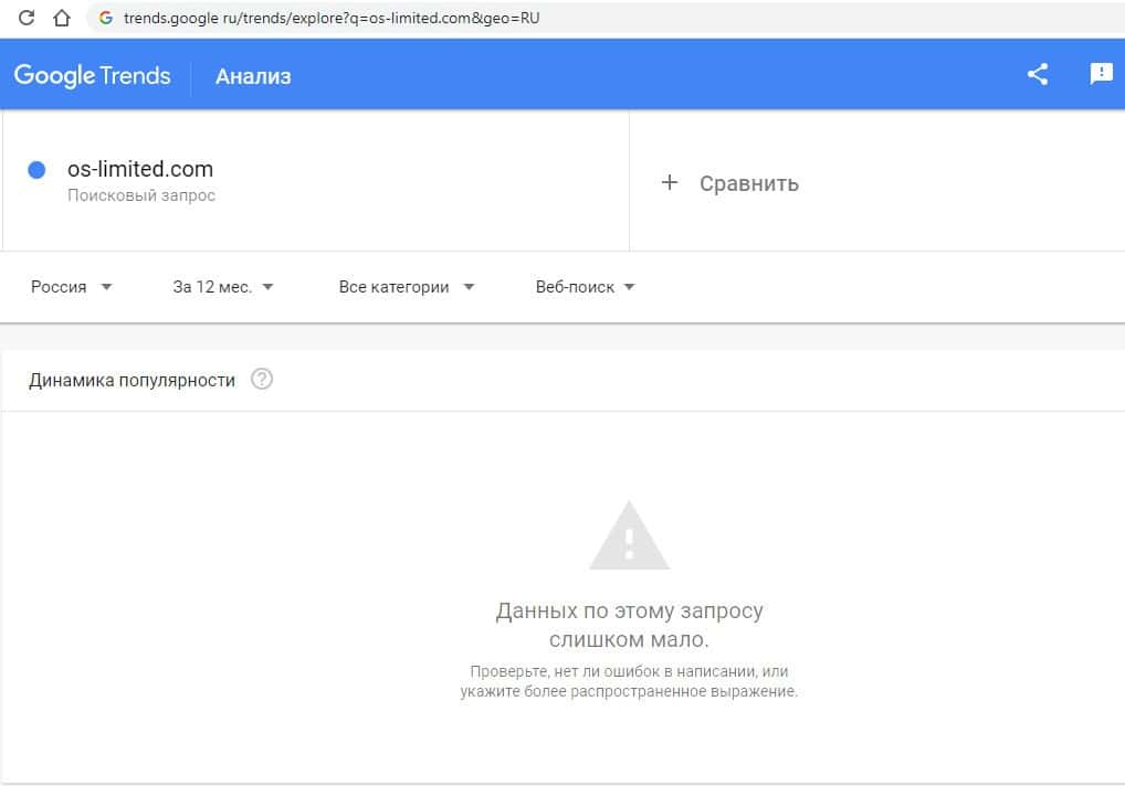 Третий и последний запрос в гугл на английском языке без пробелов и с точкой "os-limited.com" выдает точно такой же результат, как и в предыдущих 2 случаях - 0 показов.