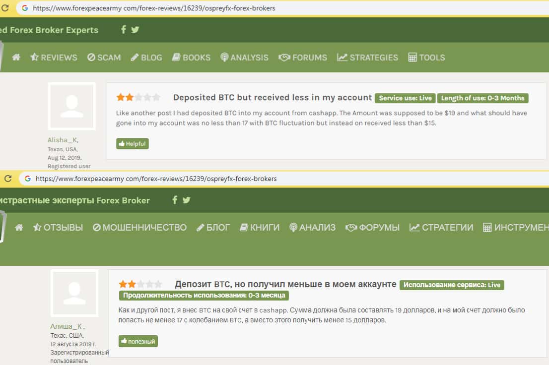 - Отзыв обманутого пользователя при выводе средств с Оспрей ФХ