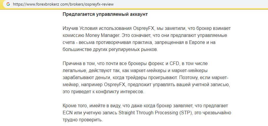 Практика некоторых пользователей показывает, что Оспрей ФХ ради получения прибыли готов даже создавать управляемые счета. И даже когда предлагает ECN или учетную запись Straight Through Processing (STP), сложно проверить, действительно ли это так. На изображении можно увидеть подробное описание такого рода мошенничества.