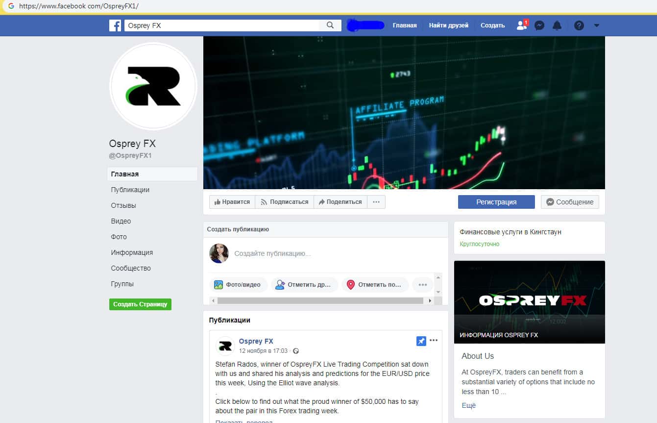 На файсбуке шулеры Оспрей ФХ расписывают свою платформу различными красивыми фразами, утверждая, что это реально выгодно и с их компанией легко и безопасно сотрудничать. На изображении ниже можно увидеть как выглядит страница обманщиков в фейсбуке, чтобы случайно не попасть в их сети.