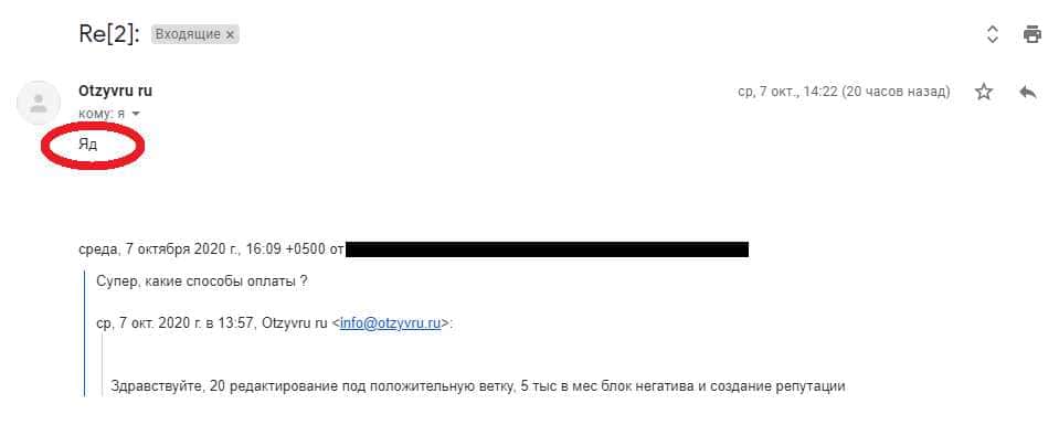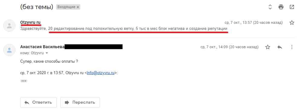Перед вами переписка жуликов OtzyvRu Com с клиентов, в которой аферисты указали, что 20000 рублей стоит изменить статью на положительную, а 5000 рублей блокировка негатива.