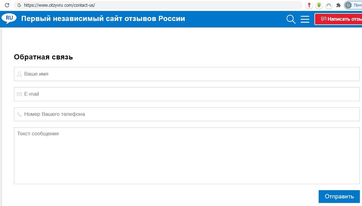 Следуя традициям всех жульнических проектов, создатели портала отзывов OtzyvRu Com разместили форму обратной связи для сбора контактной информации пользователей сети.