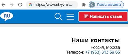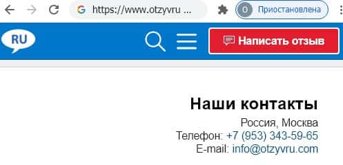 Также имеется, так сказать, "физический адрес" отзовика OtzyvRu Com, правда, больше похожий на цитату из рассказа А.П. Чехова: