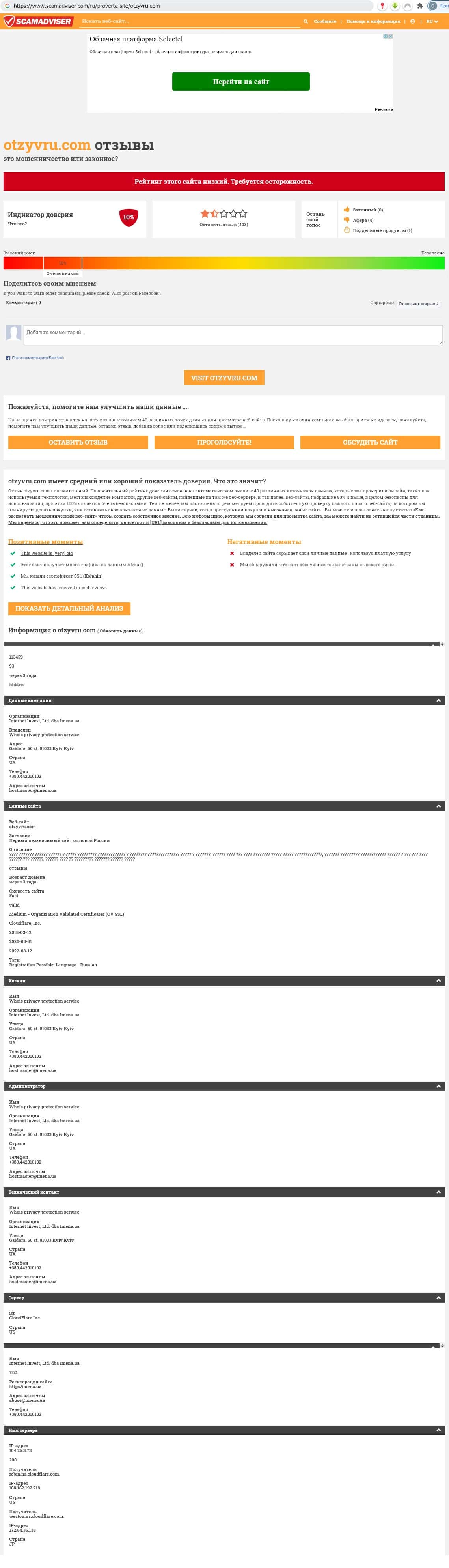 Портал scamadviser указывает на наличие признаков мошенничества порталом OtzyvRu Com, таких как скрытие данных о владельце, обслуживание из страны с высоким уровнем риска.