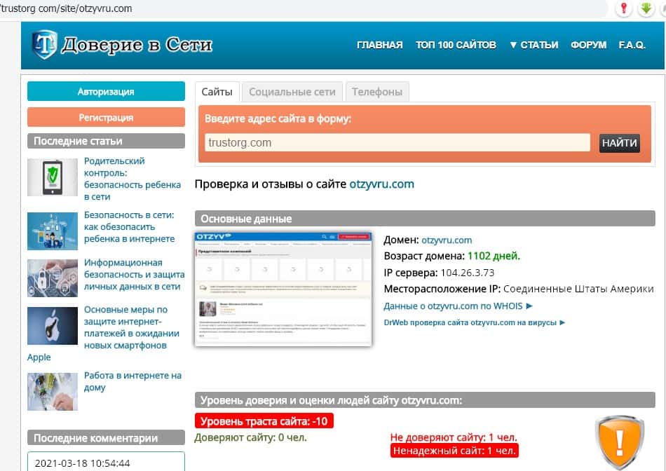 - Оценка доверии к сайту отзовика OtzyvRu Com на портале trustorg