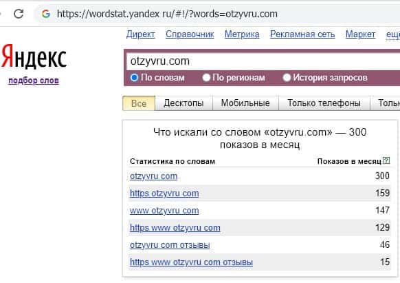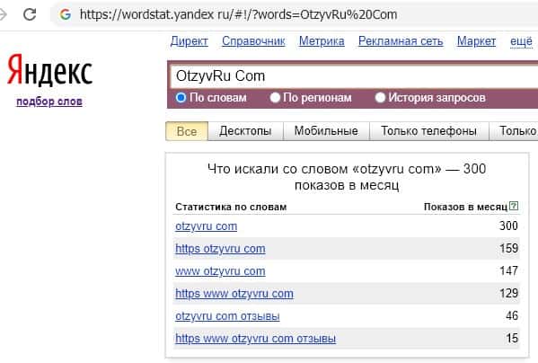 Количество поисковых запросов бренда "OtzyvRu Com" в системе яндекса невелико, всего триста в месяц, что говорит о посредственной популярности данного ресурса.