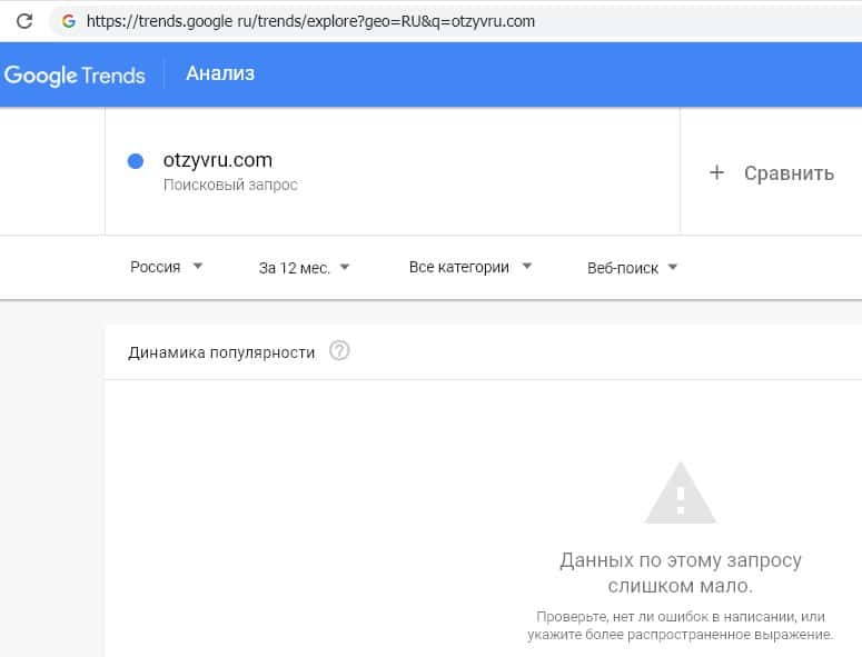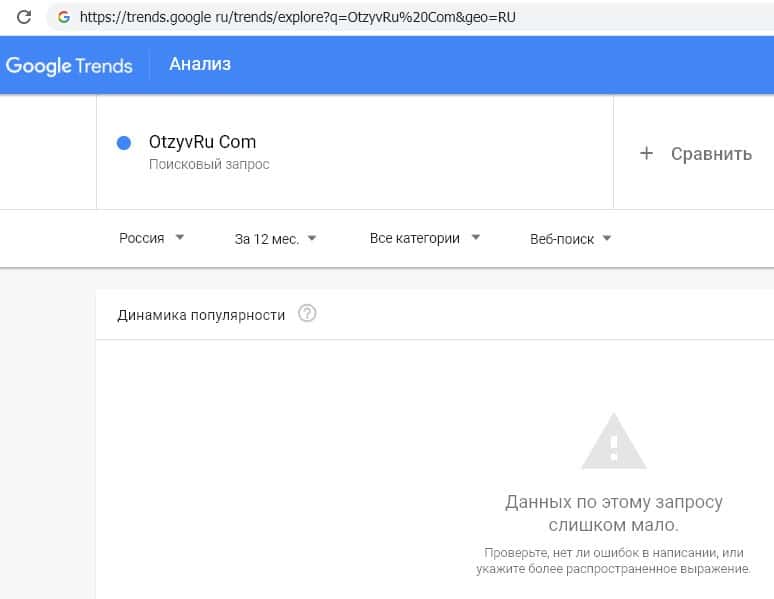 В американской поисковой системе Google дела с поисковыми запросами бренда "OtzyvRu Com" обстоят ещё хуже. GoogleTrends не располагает достаточной информацией о этом отзовике.