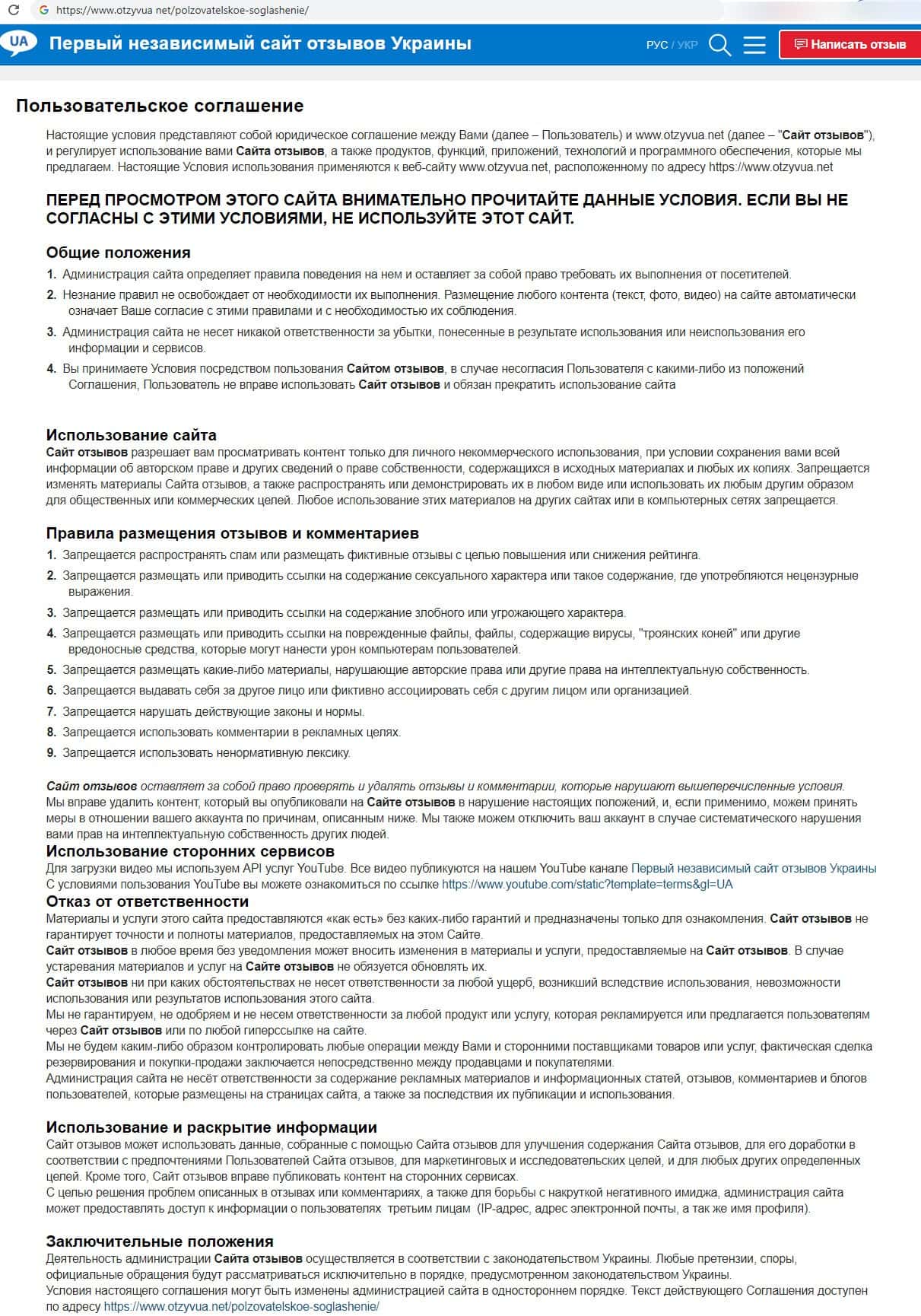 В разделе "Использование сайта" клиентского соглашения с ворьем из ОтзывЮа Нет указано на уйму незаконных ограничений для пользования веб-сервисом пользователями.
