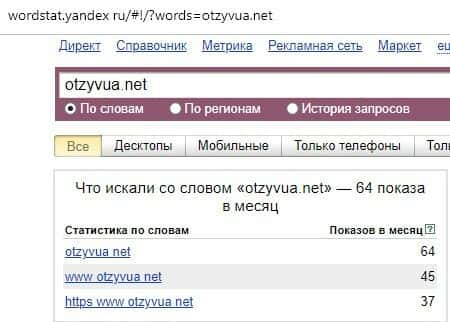64 показа - такое количество интернет-пользователей пытались найти доменное название "otzyvua.net" на английском языке с точкой в поисковой системе Яндекс.