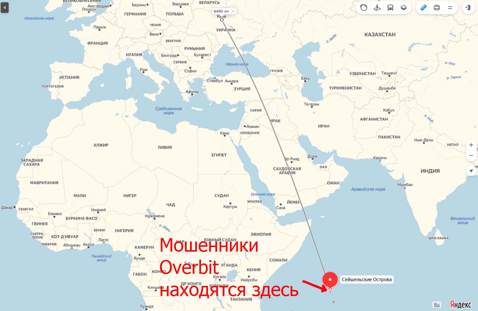 Дополнительным преимуществом для лохотрона Овербит является факт их оффшорной регистрации, а именно: 306 Victoria House, Victoria, Mahe, Seychelles, что дает шулерам Overbit анонимность их счетов и владельцев. К тому же все суды наивных пользователей с жульем Овербит будут происходить непосредственно именно на территории данного оффшора.