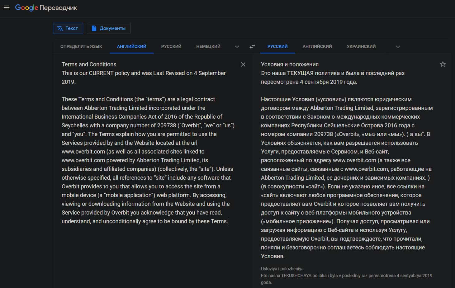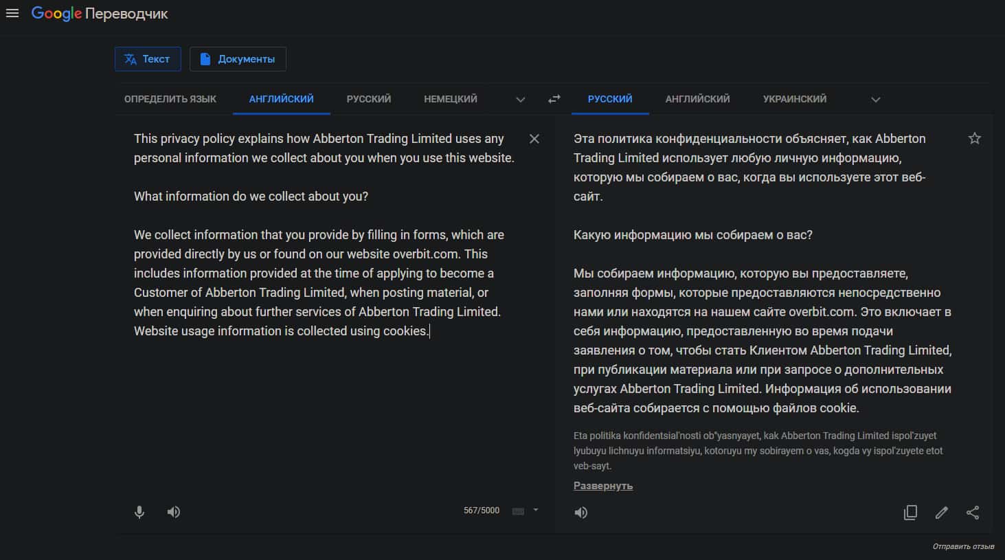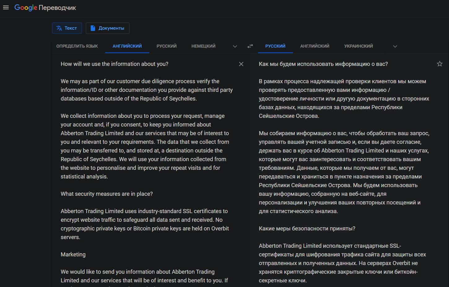 - Перечень условий политики конфиденциальности лохотрона Overbit