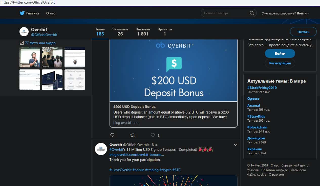 Имеется у аферистов Overbit и страница в социальной сети Твиттер, где у шулеров Овербит размещена довольно стандартная и типичная лапша на уши и имеется всего то более сотни подписчиков. На изображении, расположенном ниже, вы можете наглядно увидеть внешний вид страницы аферистов Overbit в социальной сети Twitter.
