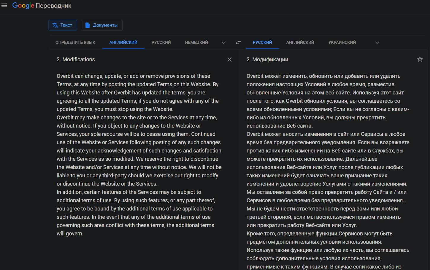 Далее аферисты Overbit в своих условиях сотрудничества говорят о том, что они могут в любой момент по своему личному и персональному усмотрению изменять данные условия сотрудничества без предварительного уведомления. На изображении, расположенном ниже, вы можете наглядно увидеть очередной раздел условий сотрудничества аферистов Овербит.