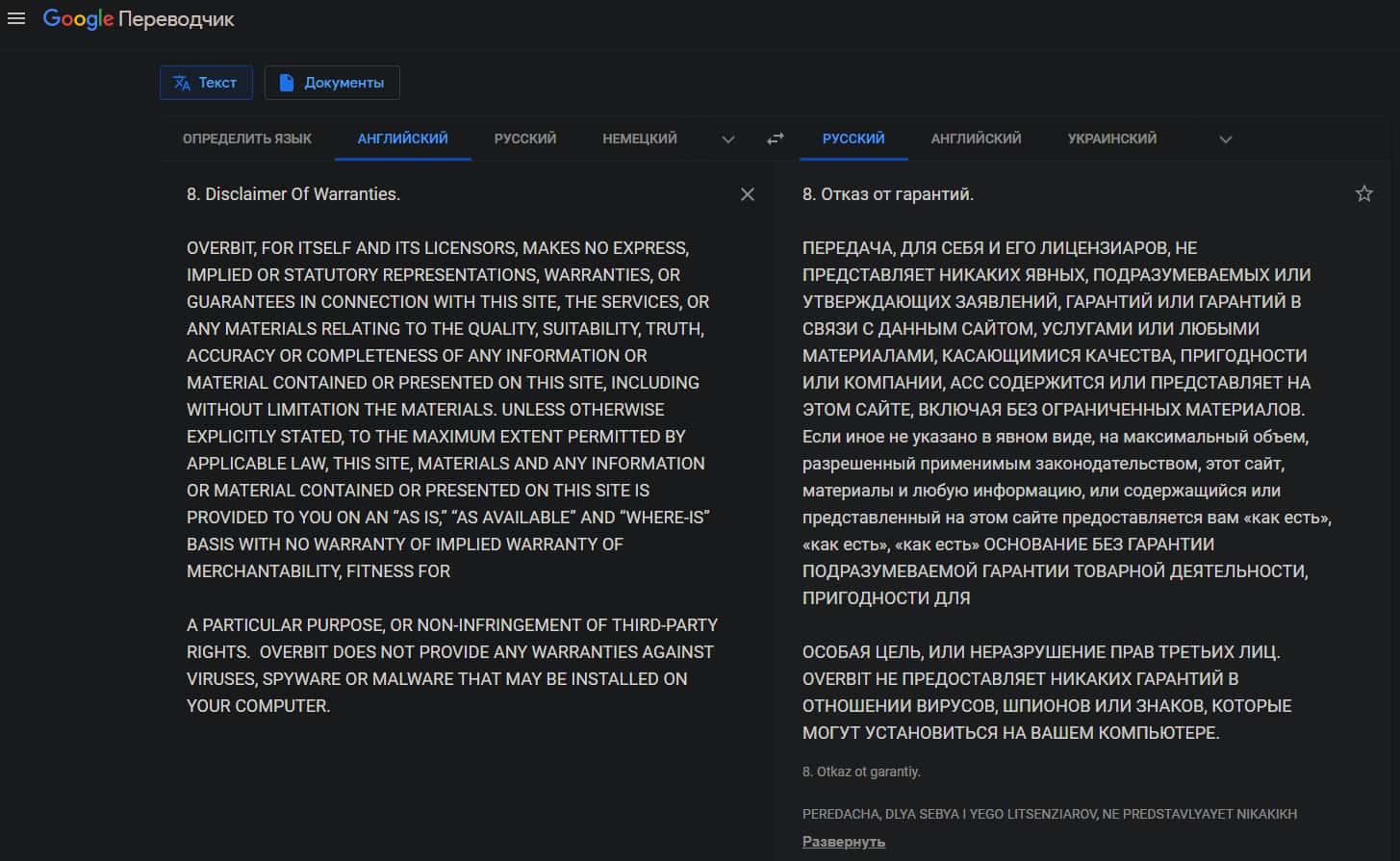 Завершаются же условия сотрудничества у проходимцев Овербит вполне стандартно и ожидаемо, а именно банальным и типичным отказом от ответственности перед наивной клиентурой за их потери на данном мошенническом сайте. На изображении, расположенном ниже, вы можете наглядно увидеть окончание подвального сайта аферистов Overbit.