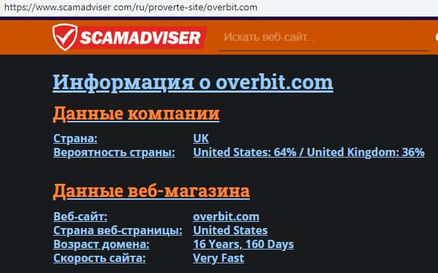 В связи с мошеннической и противозаконной деятельностью лохотрона Овербит его реальные руководители предпочитают анонимность дабы избежать ответственности со стороны правоохранительных органов. Техническую же информацию о сайте жулья Overbit можно узнать с помощью портала scamadviser com, что вы можете наглядно увидеть ниже.