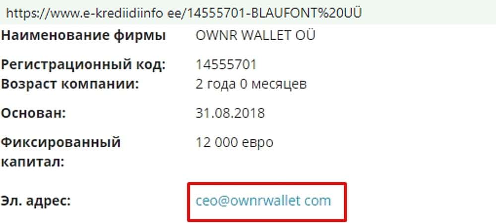 Еще одну почту можно найти в псевдорегистрационных записях шарашки OwnrWallet. По имени ее владельца можно увидеть, что принадлежит она руководителям этого криптопритона: