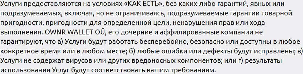 Еще в одном пункте своего фиктивного договора, кидалы Овнр Валлет умывают руки перед любыми проблемами, которые могут возникнуть у пользователя при использовании их сервиса.