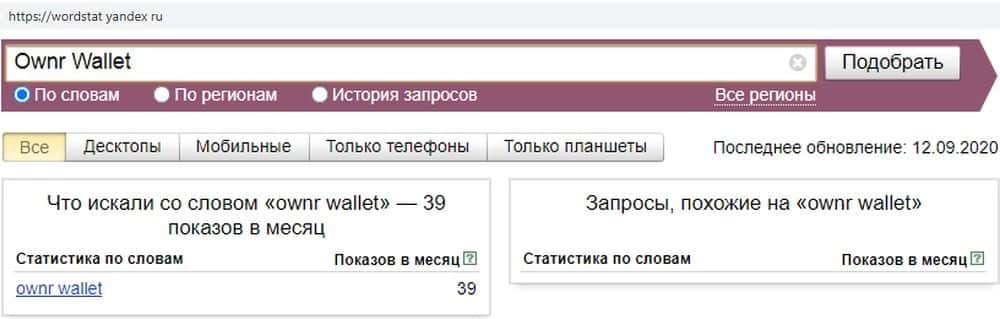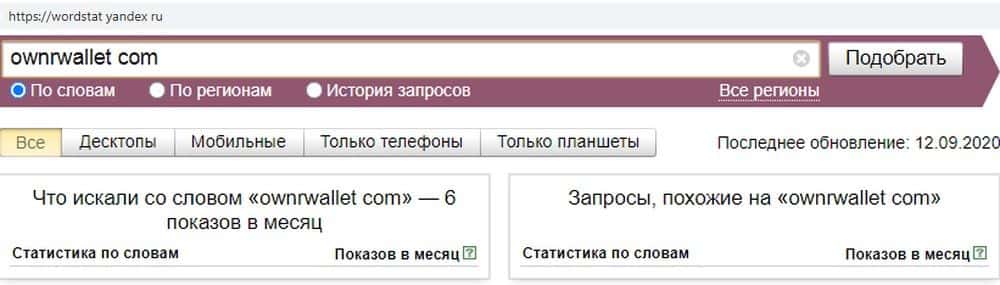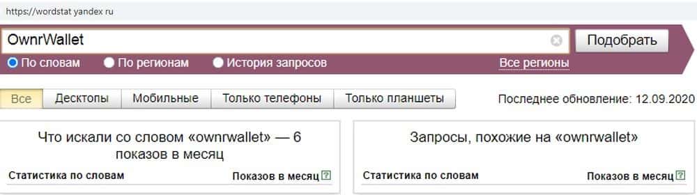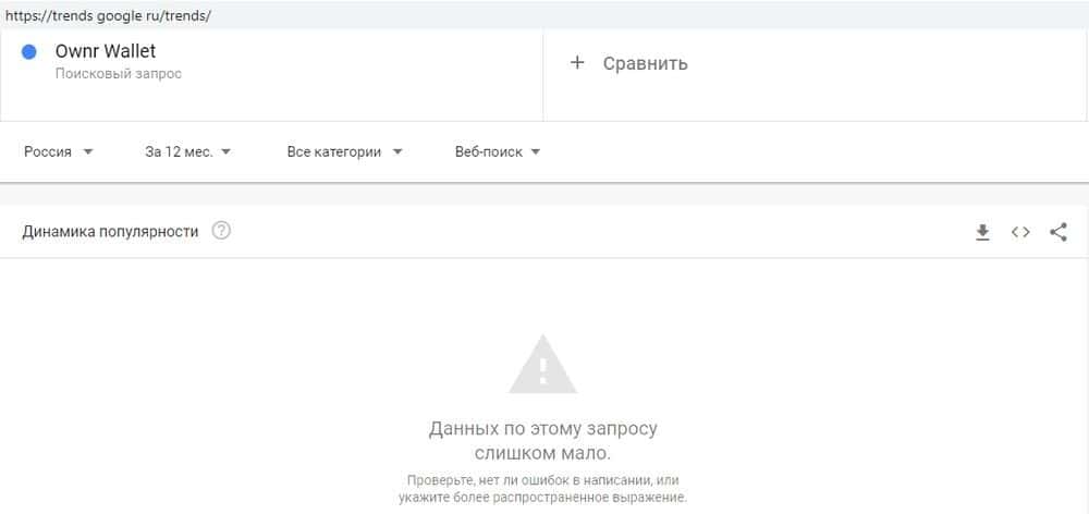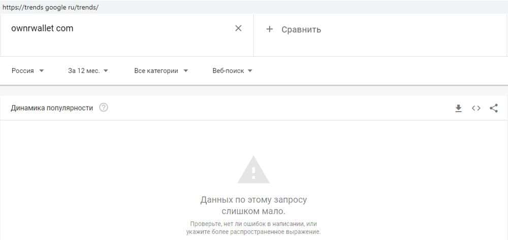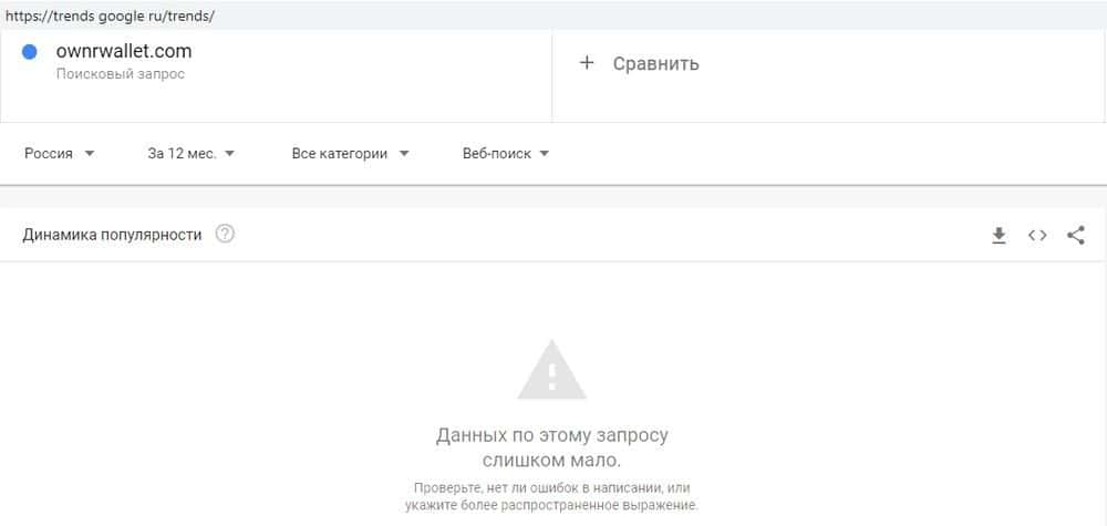 Домен мошенников OwnrWallet аналогично мало кого интересует. По запросу "ownrwallet com" всего 6 показов за месяц - сразу видно, что сомнительный проект на грани исчезновения.
