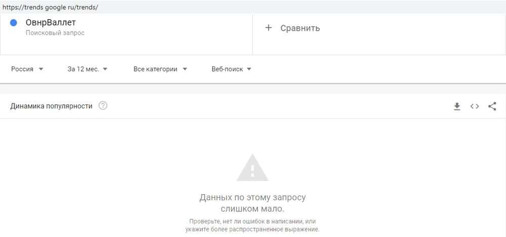 Среди пользователей Гугл лоховозка Овнр Валлет вызывает настолько мало интереса, что их сайт даже не попадает в статистику. По запросу "Овнр Валлет" ни одного обращения за год.