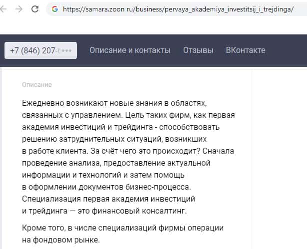 Мошенники именующие себя как "Первая академия инвестиций и трейдинга", ведут мошенническую деятельность, и по этому стараются не светится нигде, и удаляют все отзывы о своей компании. В чистке информации компания правда превзошла все ожидания, так как на просторах интернета нет ни единого отзыва о них, компания уничтожает всё.