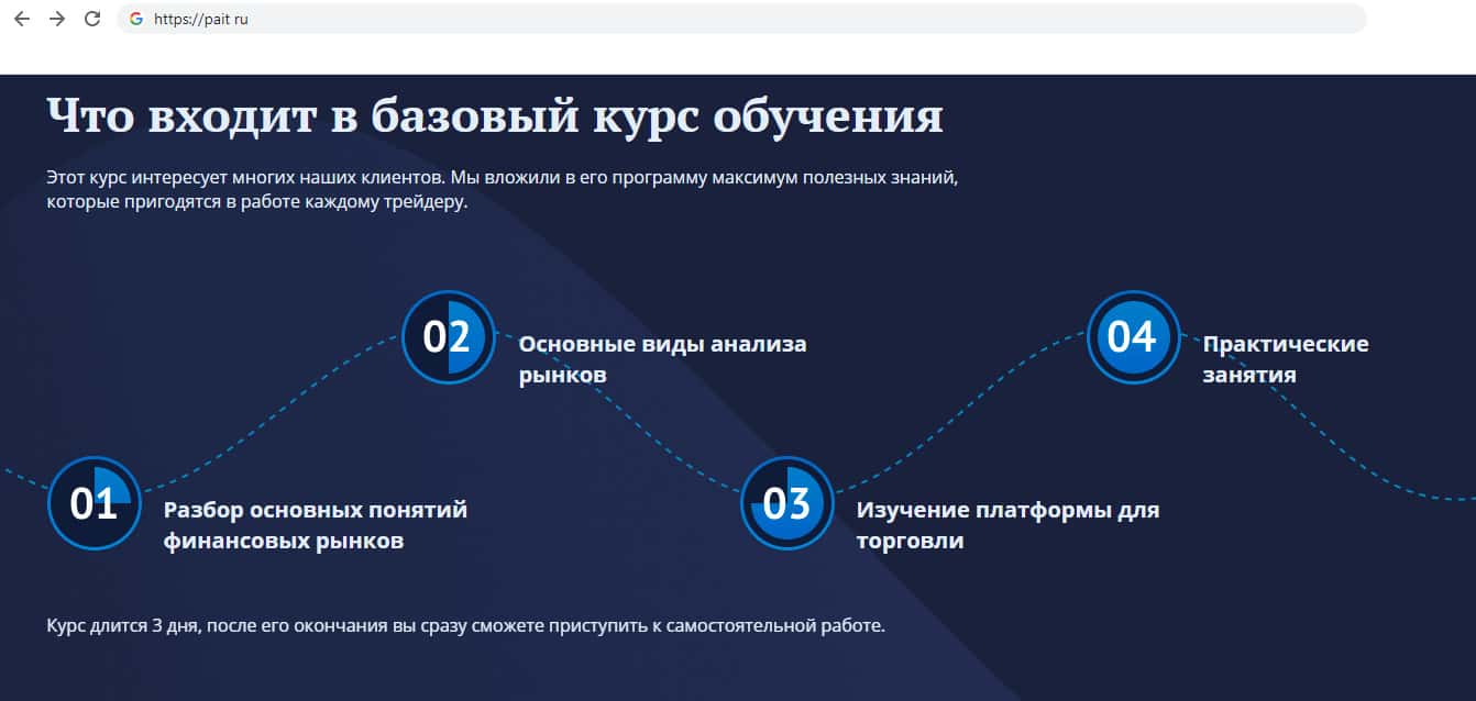 Следующие нам демонстрируют то, что входит в курс обучения, которое длится 3 дня, и после которого можно приступить к работе, но после 3 дней можно только научится вестись на разводы мошенников ПАИТ. Но в курс якобы входит разбор рынков, виды и анализ рынков, изучение платформы для торговли и практические занятия.