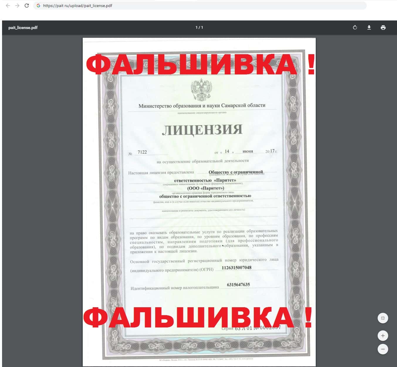 Фальшивая лицензия ПАИТ