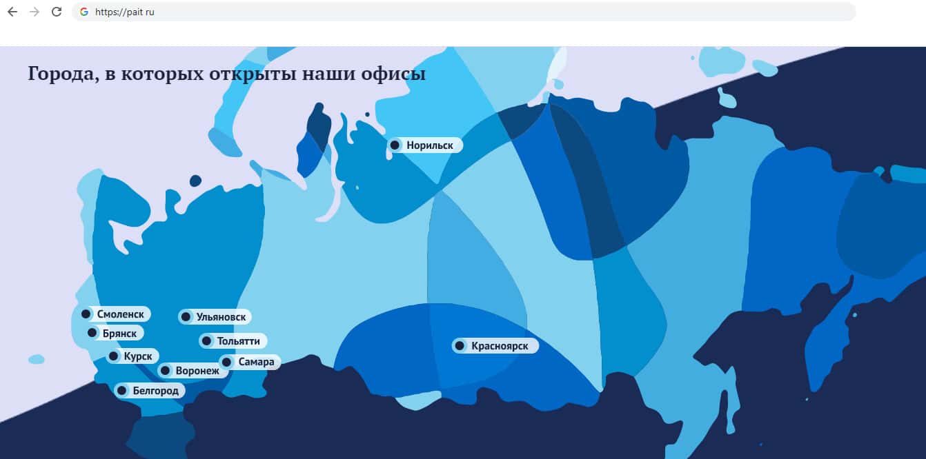 После этого мошенники ПАИТ демонстрируют какую то карту, с городами РФ, в которых якобы находятся офисы, но в этих городах нет никаких офисов, адрес единственного офиса указан лишь в Самаре, а в остальных городах нет и никогда не было никаких офисов. Мошенники просто пытаются поднять свою репутацию, за счёт вранья.