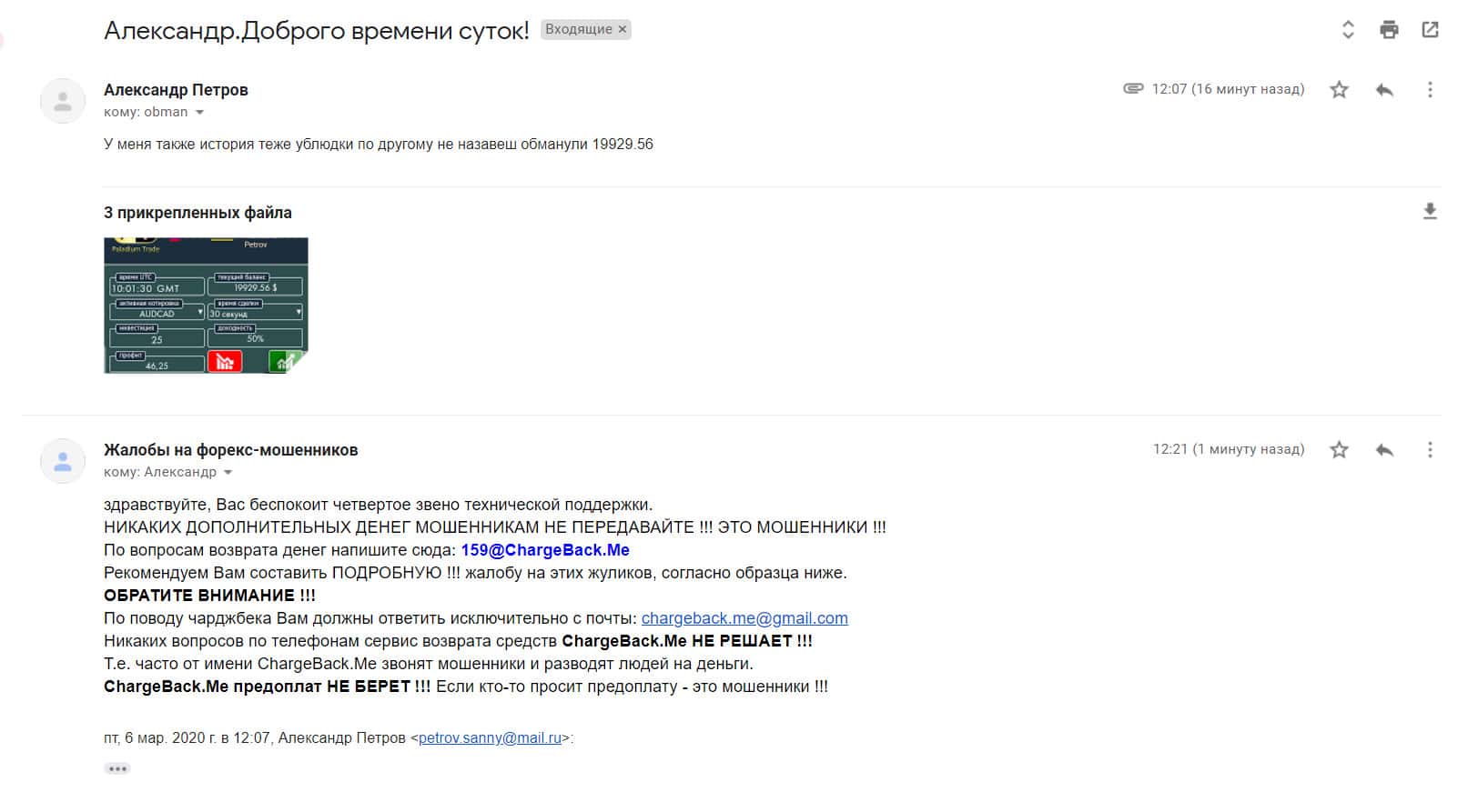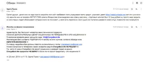 Ниже представлен скриншот письма, в котором человек просит помочь в возврате средств с шарлатанской организации PaladiumTrade. Однажды аферисты позвонили ему по телефону и предложили вложить деньги в Форекс, обещая несметные богатства. Конечно же он перевел и теперь будет жалеть об этом всю жизнь.