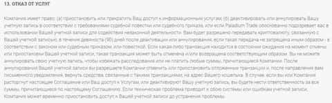 В договоре, который предоставляет контора Паладиум Трейд также есть много подводных камней. Один из них - это отказ от услуг. Лохотрон имеет право приостановить или прекратить доступ клиента к его аккаунту, а также может аннулировать не только сделку, а и весь баланс по счету. Клиент, подписав данный договор, уже заочно становится жертвой.