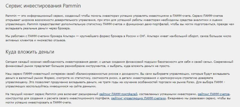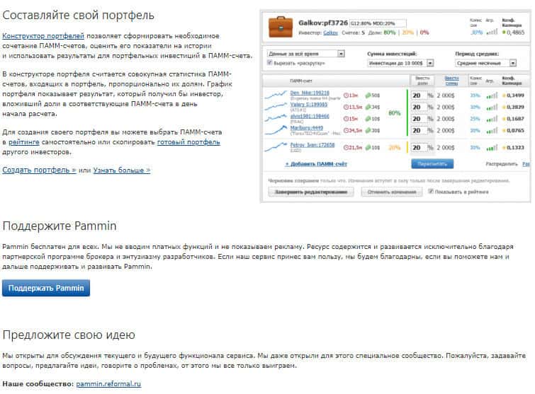 Как сообщается далее, цитируем "PamМin — это информационный сервис, созданный чтобы помочь инвесторам успешно управлять инвестициями в ПАММ-счета." И нет бы, предоставлять реальных брокеров, которые реально помогают зарабатывать деньги в сети, они предоставляют какие-то непонятные услуги "инвестиционного портфеля" который и даром не сдался.