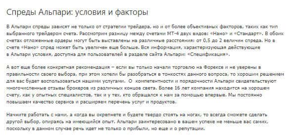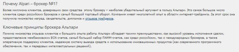 Далее, мошенническая контора перечисляет, почему же их представители лучшие. Как говорят мошенники "Более миллиона клиентов, доверивших свои средства этому брокеру – наиболее убедительный аргумент в пользу Альпари." Нет, это далеко не аргумент, скажем мы Вам. Всё потому, что всё это выглядит как конкретный лохотрон и простая реклама на сайте.