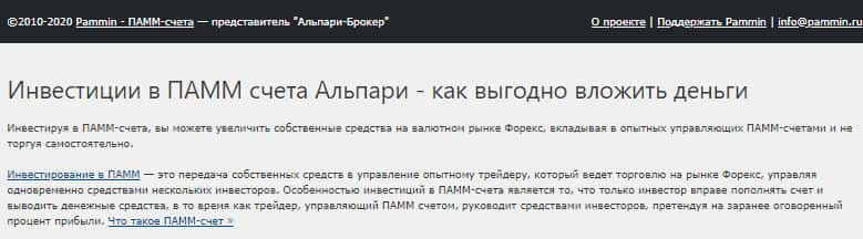 "Обучение в Альпари – это основа, с которой нужно начать, от которой зависит успех работы трейдера. Торговля на Форекс – это вовсе не вопрос удачи и везения, как принято считать среди людей, которые никогда не видели, из чего на самом деле состоит рабочий день биржевого трейдера." Вот что говориться в начале сайта мошеннической конторы PamMin.