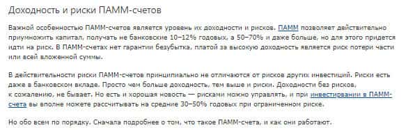 Подходим к не менее интересной теме "доходность и риски ПАММ-счетов". Как ни странно здесь есть хотя-бы слово "риски", но толкового нет ничего, кроме как "риски есть даже в банковском вкладе". Хорошо, но почему нет толкового разъяснения: почему риск есть? Как предотвратить риски, дабы не было потери? и так далее. Руководству не выгодны умные люди.