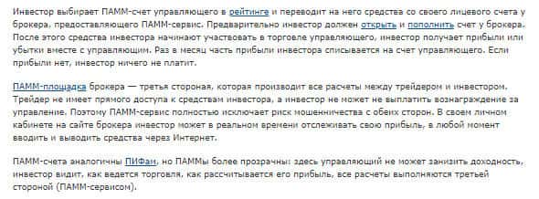 "Когда трейдер решает предложить инвесторам управление их средствами, он открывает ПАММ-счет. После этого любой желающий может вложить свои средства в его торговлю через Интернет и получать прибыль вместе с ним, не торгуя самостоятельно." Так начинается статья мошенников ПамМин которые хотят, дабы Вы инвестировали в их мошенническую контору.