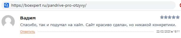 Трейдер в своем негативном отзыве на информационном интернет-канале boexpert ru выразил свое мнение о том, что официальный сайт инвестиционной компании PanDrive Pro сделан, конечно же, красиво, но это просто обыкновенный хайп-проект для отъема денежных средств у клиентов.