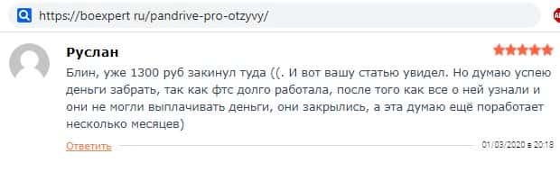 Доверчивый трейдер в своем отзыве на информационно-аналитическом ресурсе boexpert ru сообщает о том, что вложил в инвестиционную хайп-компанию PanDrive Pro уже 1300 рублей, и надеется, что эта контора не закроется, как некоторые другие в ближайшее время, и он все-таки успеет снять свои деньги.