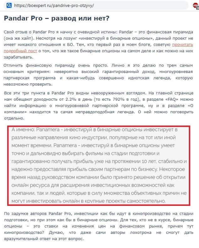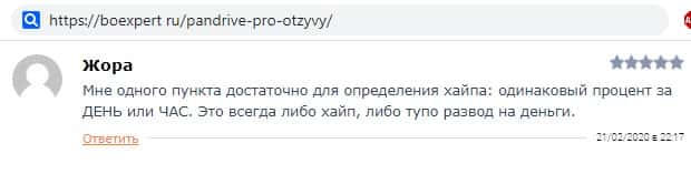 Прозорливый трейдер сообщил в своем отзыве на информационном интернет-ресурсе boexpert ru о том, что сразу же после изучения рекламы на официальном сайте инвестиционной хайп-компании PanDrive Pro, он понял, что это лохотрон, замаскированный под финансовую пирамиду, и ждать выплаты денег там бессмысленно.