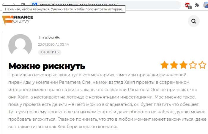 Вдумчивый трейдер в своем отзыве на информационно-аналитическом веб-ресурсе financeotzyvy com справедливо заметил, что компания Panamera One, она же PanDrive Pro, представляет собой хайп-проект, и в нее можно вкладываться, пока у нее есть деньги и она будет платить, но со временем она обязательно лопнет, как и любая другая финансовая пирамида.