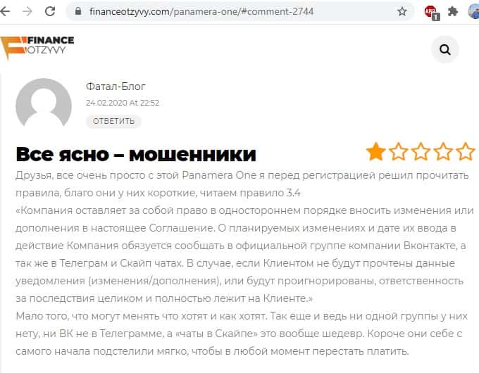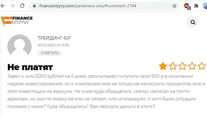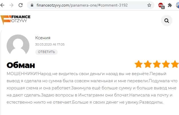 Обманутая клиентка мошеннической инвестиционной компании Panamera One в своем отзыве на информационном портале financeotzyvy com рассказывает о том, что мошенники из этой конторы отказывают ей в выводе денежных средств, на связь не выходят, одним словом - разводилово.