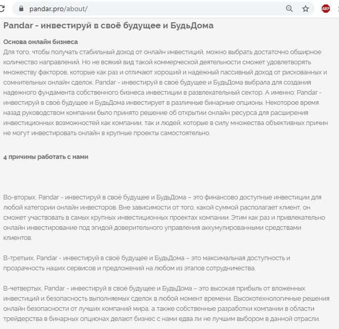 Некоторые сведения об официальном веб-ресурсе инвестиционной компании PanDrive Pro (Pandar Pro)