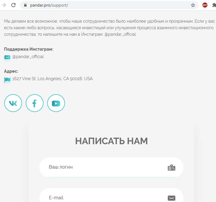 Для связи инвесторов с администрацией или службой поддержки компании Pandar Pro на ее официальном сайте приведена довольно скудная информация, - адрес в сети Инстаграм и официальный юридический адрес, есть еще интерактивная форма связи для отправки сообщений инвесторов, - но ни адреса электронной почты, ни номеров телефонной связи в разделе контактов не представлено. Хотя в подвальной части сайта все же нашелся адрес электронной почты: