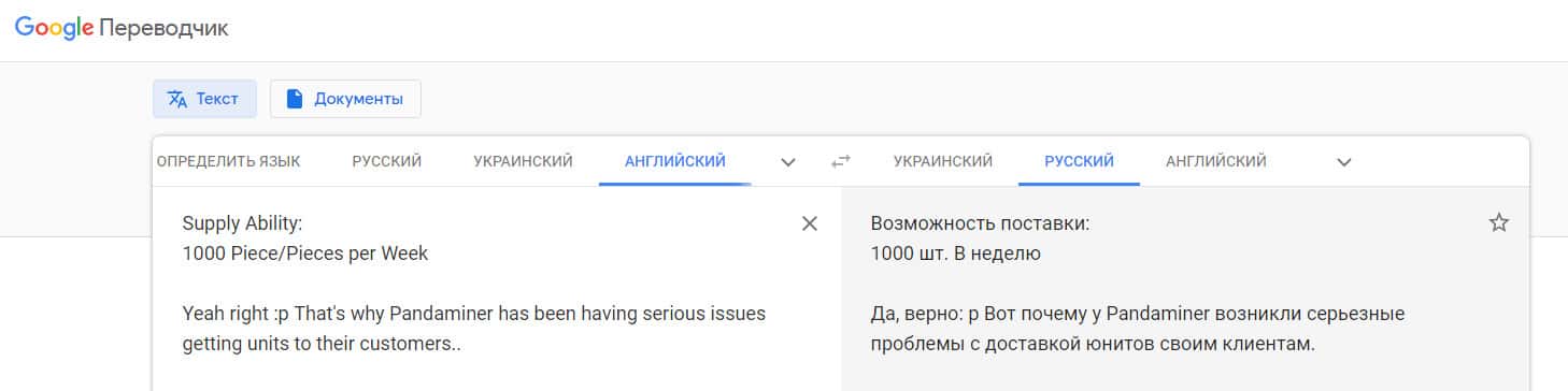 На скриншоте, расположенном ниже, можно увидеть перевод отзыва с английского на русский язык через гугл переводчик. Основная мысль комментария состоит в том, что мошенники PandaMiner не справляются должным образом с доставкой оборудования своим клиентам.